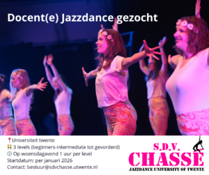 Per januari 2026 komt bij S.D.V. Chassé, de jazzdancevereniging van de Universiteit Twente, de positie van docent(e) Jazzdance vrij. We zoeken iemand die minimaal anderhalf academisch jaar beschikbaar is (langer is gewenst).
